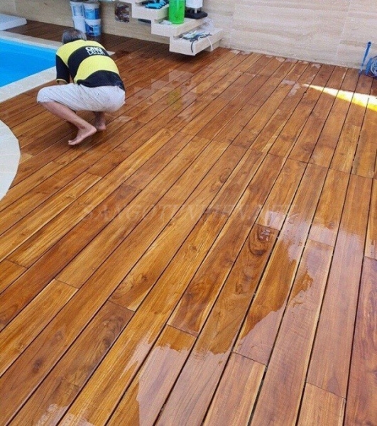Sàn gỗ Teak ngoài trời thường được làm từ Teak được xử lý để chống nước và chống mối mọt.